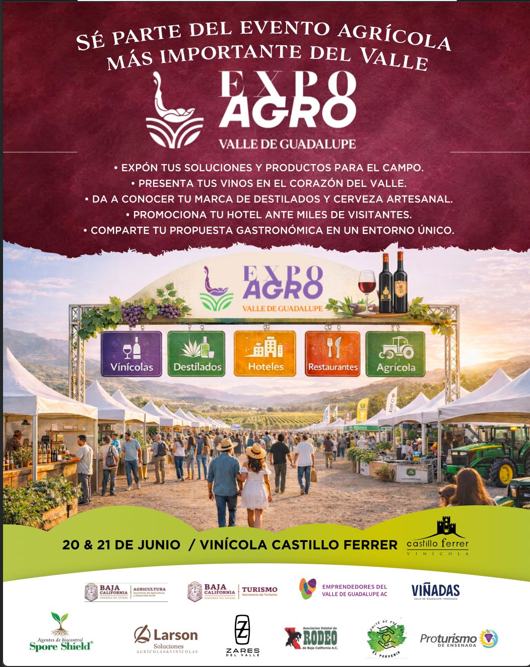 Expo Agro Valle de Guadalupe se realizará por primera vez en la zona vinícola del Valle de Guadalupe donde se busca reunir al sector agrícola, más de 20 vinícolas de la región, diferentes expositores en el área gastronómica, empresas en el sector turístico y de entretenimiento en una experiencia de dos días que impulsa la innovación, el negocio, el orgullo regional y turismo rural. Expo Agro Valle de Guadalupe combinara la feria agrícola, encuentro de productores, exposición de maquinaria, talleres, demostraciones, show ecuestre, charrería, gastronomía local, música en vivo y pabellones temáticos, se esperan más de 3,000 asistentes listos para descubrir, comprar, comparar y crear alianzas.
