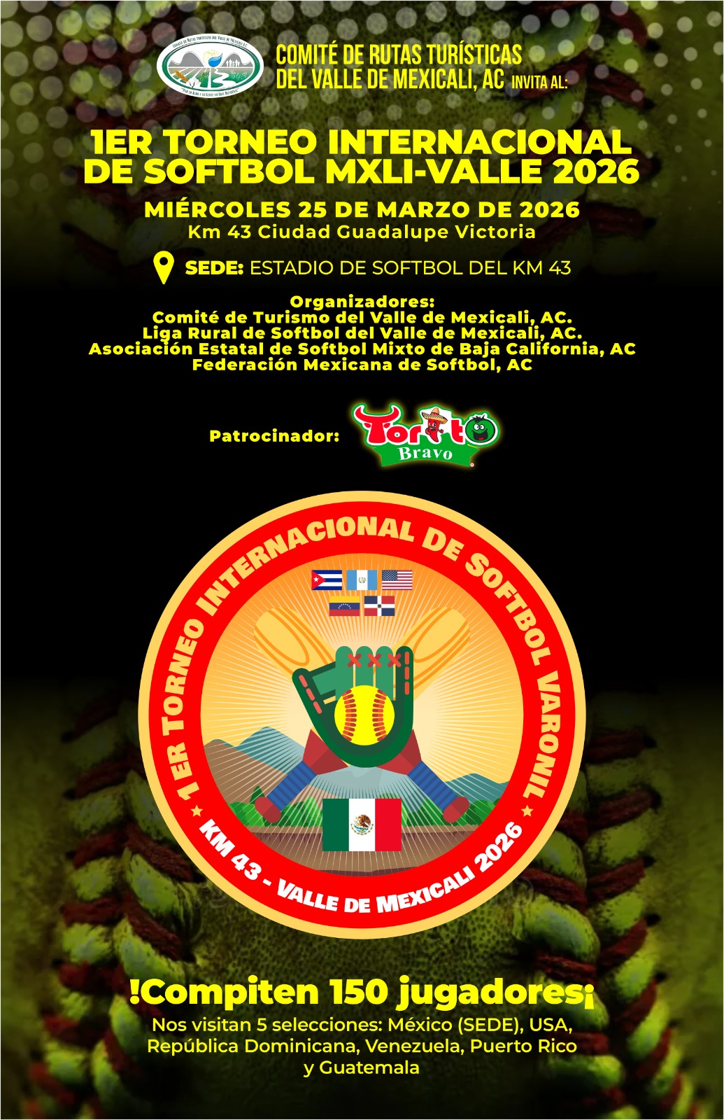 1er Torneo Internacional de Softbol Mexicali-Valle 2026. Evento con causa: Comite ciudad deportiva de beisbol Challenger del valle de mexicali y pro construccion unidad deportiva Turistica Incluyente. Compiten 150 jugadores de 5 selecciones, Mexico (sede), USA, Republica Dominicana, Venezuela, Puerto Rico y Guatemala.